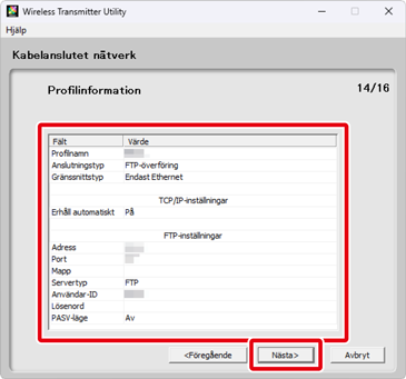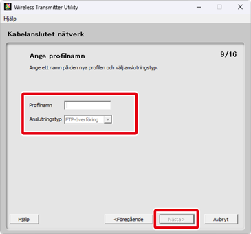 Ange ett profilnamn på upp till 16 tecken och välj en anslutningstyp från FTP-överföring, Bildöverföring, Camera control eller HTTP-server. Klicka på Nästa när inställningarna har slutförts.