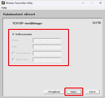 Om du valde Automatisk installation (rekommenderas) i steg 7 kommer TCP/IP-inställningarna att justeras automatiskt. Fortsätt till Steg 9. Observera att Automatisk installation (rekommenderas) inte är tillgänglig om: