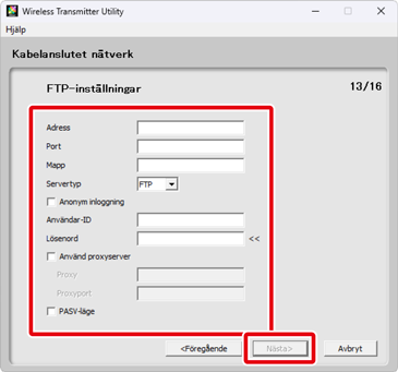 FTP-serverinställningar är endast tillgängliga om FTP-överföring har valts i Steg 6. Fortsätt till Steg 10 om ett annat alternativ har valts. Klicka på Nästa när du har justerat inställningarna. För mer information, se tabellen nedan.