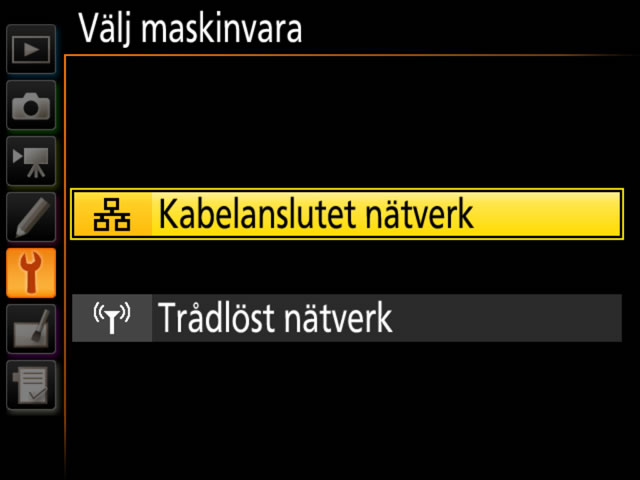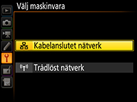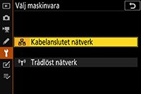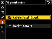 Välj Kabelanslutet nätverk/WT > Välj maskinvara > Kabelanslutet nätverk i kamerans inställningsmeny.