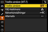 Välj Trådlös sändare (WT-7) > Välj maskinvara > Trådlöst nätverk i kamerans inställningsmeny.