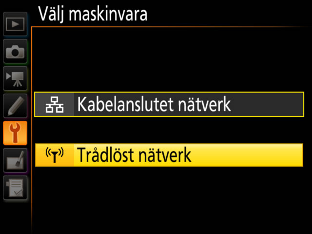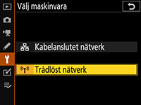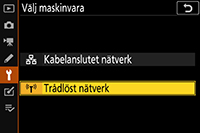 Välj Nätverk > Välj maskinvara > Trådlöst nätverk i kamerans inställningsmeny.