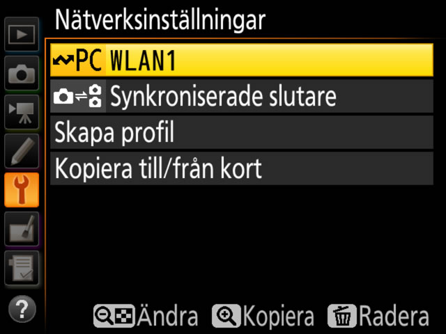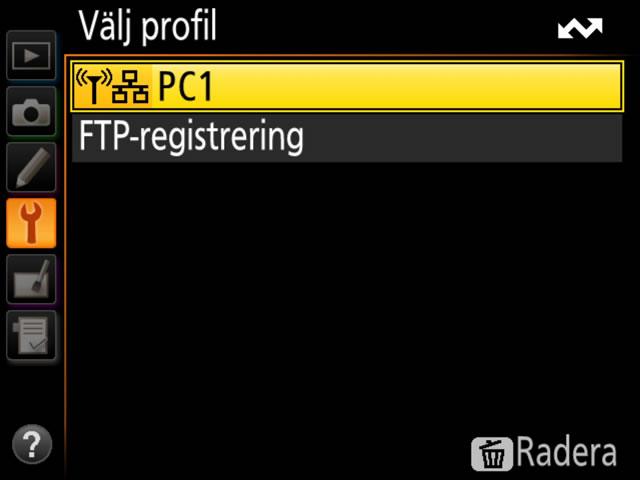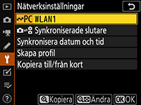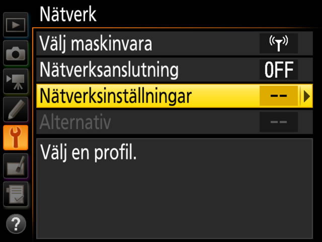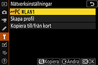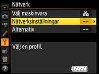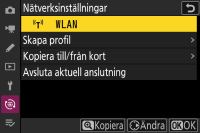 Markera en profil och tryck multiväljaren åt höger för att återgå till Nätverk-menyn. Vänta medan kameran upprättar anslutningen.