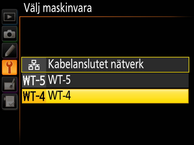 Välj Nätverk > Välj maskinvara > WT-4 i kamerans inställningsmeny.