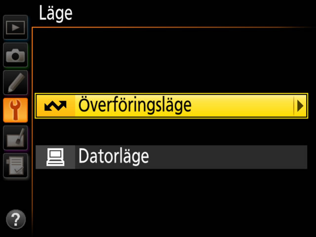 Välj mellan Överföringsläge och Datorläge. Om du trycker multiväljaren åt höger visas en lista över nätverksprofiler.