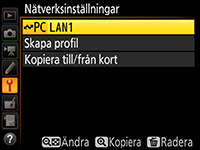 Markera en profil och tryck multiväljaren åt höger för att välja och återgå till Nätverk-menyn. Om du valde Överföringsläge i steg 3, justera Överföringsinställningar enligt beskrivningen i handboken för WT-4.