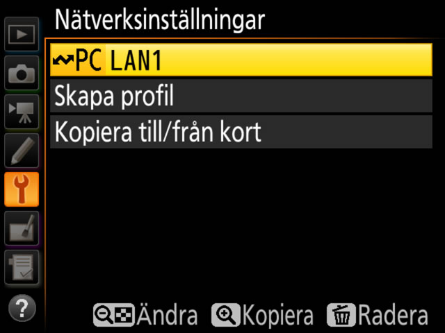 Markera en profil och tryck multiväljaren åt höger för att återgå till menyn Kabelanslutet nätverk/WT. Vänta medan kameran upprättar anslutningen.