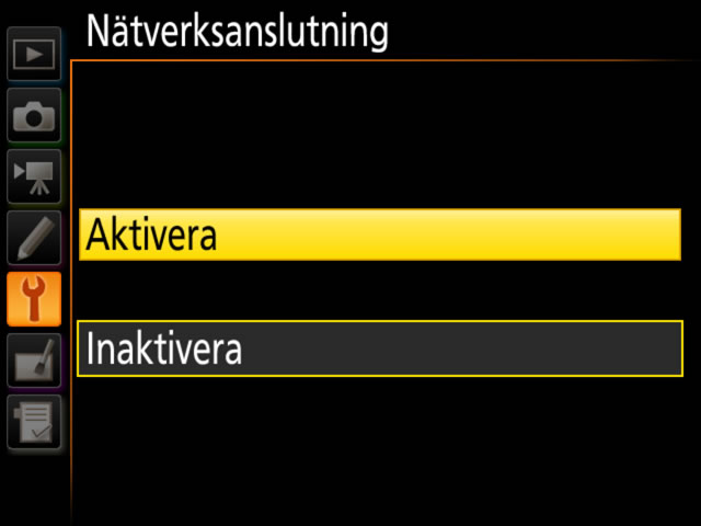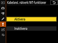 Välj Aktivera för Kabelanslutet nätverk/WT > Kabelansl. nätverk/WT-funktioner i kamerans inställningsmeny.