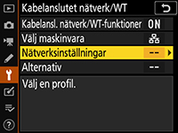 Välj Kabelanslutet nätverk/WT > Nätverksinställningar i kamerans inställningsmeny.