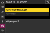 Välj Anslut till FTP-servern > Nätverksinställningar i kamerans nätverksmeny.
