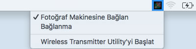 - Wireless Transmitter Utility yüklendiğinde, menü çubuğundaki Wireless Transmitter Utility simgesi fotoğraf makinesi ile olan bağlantıyı sonlandırmak veya Wireless Transmitter Utility’yi başlatmak için kullanılabilir. Aşağıdakiler yalnızca çalışma modu olarak Görüntü aktarımı seçildiğinde kullanılabilir: