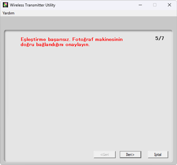 Wireless Transmitter Utility, fotoğraf makinesi ile bilgisayarı otomatik olarak eşleştirecektir. Eşleştirme tamamlandığında fotoğraf makinesi ve Wireless Transmitter Utility bunu ifade eden mesajlar görüntüleyecektir; fotoğraf makinesinde Tamam düğmesine basın ve Wireless Transmitter Utility’de İleri öğesine tıklayın.