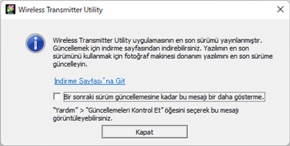 Fotoğraf makinenizin modeline bağlı olarak, yalnızca Connection Profile’ı değil, aynı zamanda Wireless Transmitter Utility’yi de güncellemeniz gerekebilir. Bu durumda, uygulamayı başlattığınızda bir bildirim diyaloğu görünecektir. Aynı zamanda bildirim diyaloğunu Yardım menüsündeki Güncellemeleri Kontrol Et seçeneğinden görüntüleyebilirsiniz.