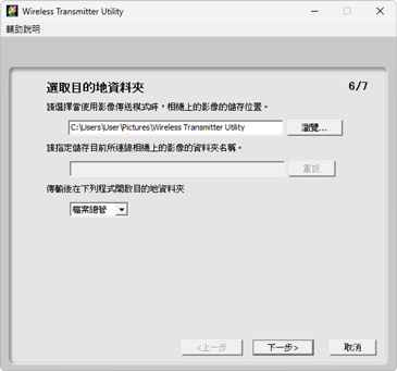 若要為從相機下載的照片選擇子檔案夾,請關閉視窗,透過 USB 連接相機和電腦,然後重新啟動 Wireless Transmitter Utility。當提示您選擇硬件時,請選擇 相機內置 Wi-Fi,按一下 下一步,然後在彈出的對話窗中選擇 選取目的地資料夾和應用程式。按一下 下一步 將轉到一個對話窗,您可以在其中選取目的地檔案夾下的子檔案夾。