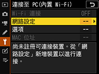 - Z7II / Z6II / Z7 / Z6 / Z5 / Z50 / Z30 / Zfc / D780:設定選單 > 連接至 PC > 網路設定