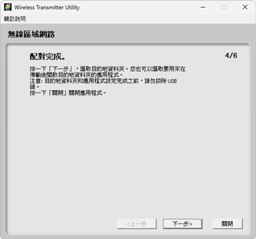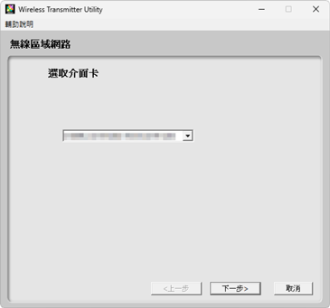 按照螢幕上的指示說明建立連線並啟動 Wireless Transmitter Utility。出現提示時,請從 Wireless Transmitter Utility 的下拉選單中選擇一個無線區域網路配接器。