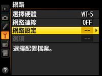 在相機設定選單中選擇 網路 > 網路設定,並按照螢幕上的指示說明建立網路配置檔案。有關建立乙太網配置檔案的資訊,請參見相機隨附的 網路指南。有關使用 WT-7 或 WT-5 的資訊,請參見該裝置隨附的文件。