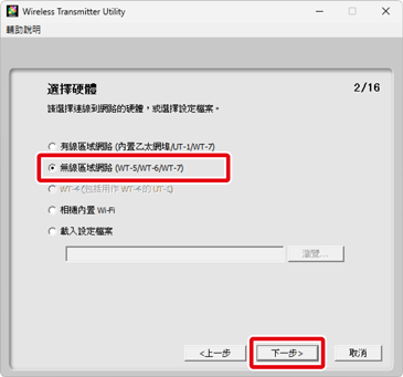 選擇 無線區域網路 (WT-5/WT-6/WT-7) 並按一下 下一步。