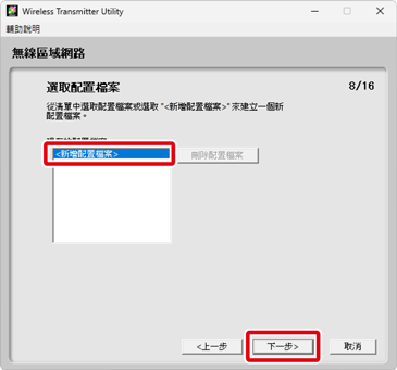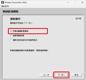 若要編輯一個現有網路配置檔案,請將其選定並按一下 下一步。若要刪除一個現有配置檔案,請將其選定並按一下 刪除配置檔案。Wireless Transmitter Utility 無法用於變更已使用相機 密碼保護 選項進行保護的配置檔案。刪除或修改配置檔案之前,請將 密碼保護 選為 關閉。