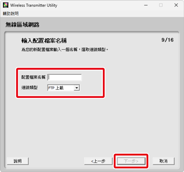 輸入一個最多 16 個字元的配置檔案名稱,並從 FTP 上載、影像傳送、相機控制 和 HTTP 伺服器 中選擇一種連線類型。設定完成時按一下 下一步。