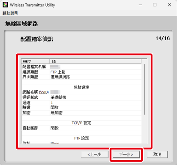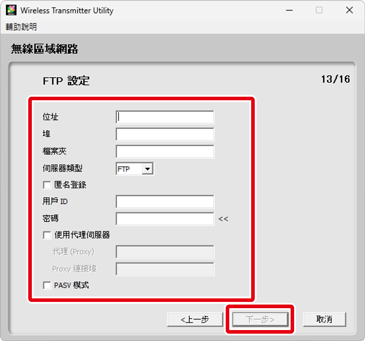 僅當在步驟 6中選擇了 FTP 上載 時,FTP 伺服器設定才可用。若選擇了其他選項,請進入步驟 11。調整設定後,按一下 下一步。有關詳情,請參見下表。