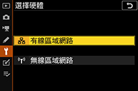 在相機設定選單中選擇 有線區域網路/WT > 選擇硬體 > 有線區域網路。