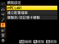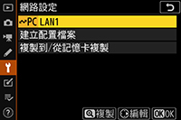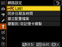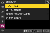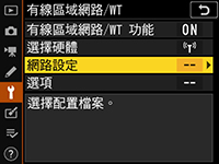 在相機設定選單中選擇 有線區域網路/WT > 網路設定。