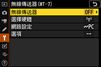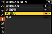 在相機設定選單中選擇 無線傳送器(WT-7) > 網路設定。