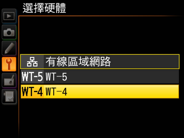 在相機設定選單中選擇 網路 > 選擇硬體 > WT-4。