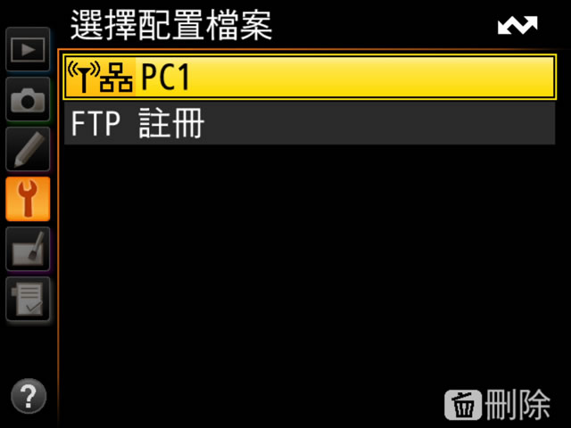 反白顯示一個配置檔案,然後按下 OK 按鍵可返回 連接至 FTP 伺服器 選單,此時相機將啟動與網路的連接。
