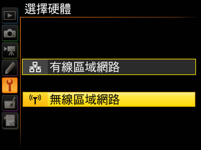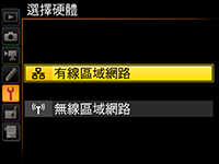 在相機設定選單中選擇 有線區域網路/WT > 選擇硬體 > 無線區域網路。