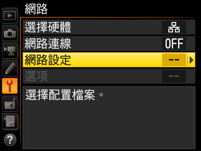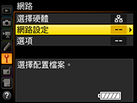 在相機設定選單中選擇 網路 > 選擇硬體 > 無線區域網路。