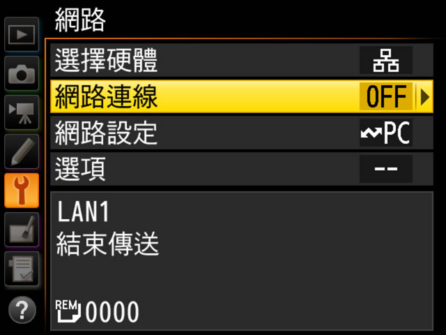 - Z9:將相機網路選單中的 有線區域網路 選為 OFF。