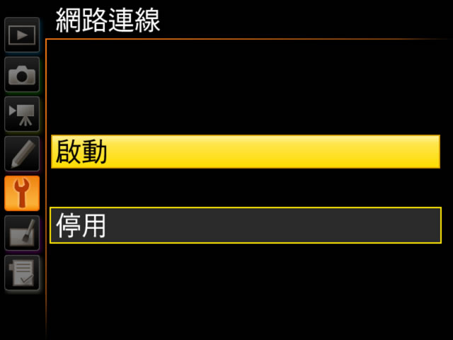 在相機設定選單中將 有線區域網路/WT > 有線區域網路/WT 功能 選為 啟動。