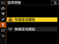 在相機設定選單中選擇 網路 > 選擇硬體 > 有線區域網路。