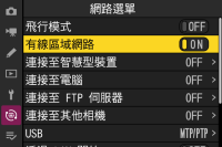 - Z9:將相機網路選單中的 有線區域網路 選為 ON。