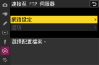 在相機網路選單中選擇 連接至 FTP 伺服器 > 網路設定。